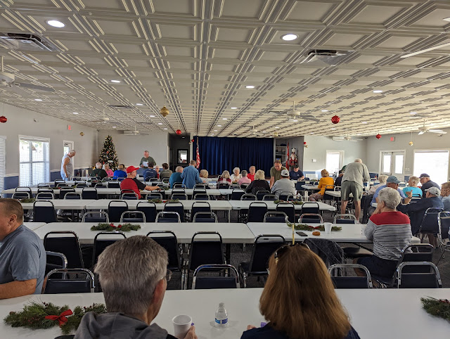 At this park every Monday there is a meeting at 8:30 a.m. where everyone is advised of activities, etc. coming up. Free coffee and donuts are provided. I sat with a nice bunch of people. I am sure I will not remember most of their names. LOL The clubhouse is large and really nice. Here is a picture taken from the back just in front of the kitchen. Almost all the tables filled up before the meeting started.
